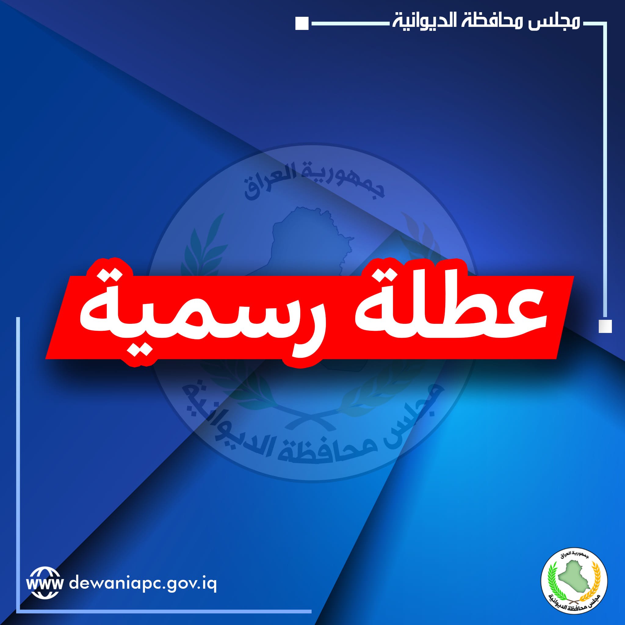 مجلس محافظة الديوانية يعلن عن تعطيل الدوام الرسمي لمدة ثلاثة أيام ابتداءا من يوم الثلاثاء الموافق ٢٠/ ٨ لغاية يوم الخميس الموافق ٢٢/ ٨ / ٢٠٢٤